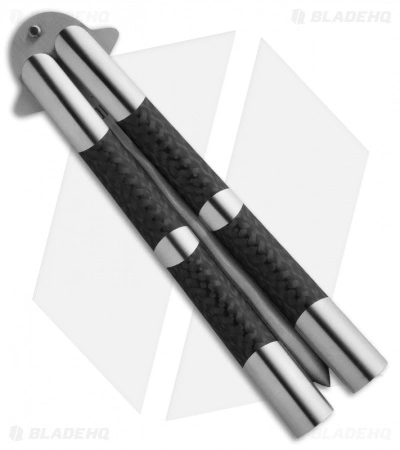 This Chris Olofson 29 Knives balisong features a double-edged 4″ Kriss style blade. The handle is 303 stainless steel with dove-tailed carbon fiber scales. Channel construction, latchless design. This is an impressive knife at any angle.