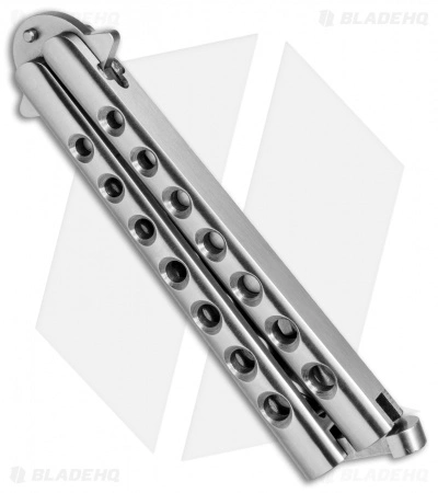This Chris Olofson 29 Knives balisong features a 4″ Scimitar style blade made from ATS-34 stainless steel with standard ears. It’s outfitted with stainless steel deluxe skeleton handles, hidden pins, and a batangas latch. This butterfly knife offers top quality materials and an impressive overall build.