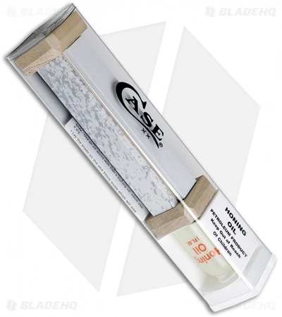 This Case Cutlery EZ-Honing Sharpening System features three Arkansas oil stones mounted on a hardwood block: a Silicon Carbide (coarse grit), soft arkansas oil stone (medium grit), and hard arkansas oil stone (fine grit). Includes honing oil and plastic carrying case with complete instructions.
