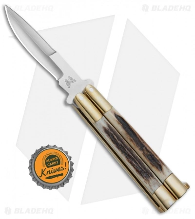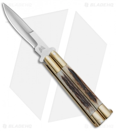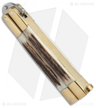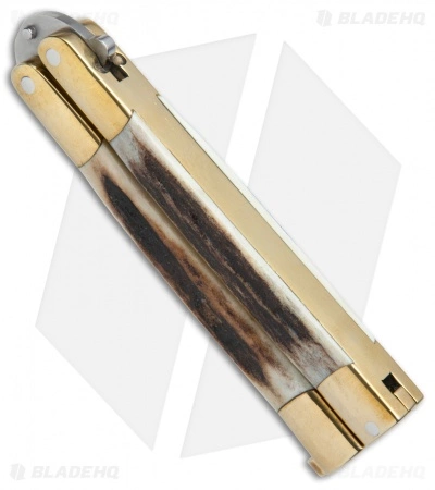 This knife has a beautiful Jody Samson deep hollow ground blade with sharpened swedge. It features brass handles and stag inlays. The blade is marked with the Bali-Song Butterfly logo on one side of tang and “BALI-SONG U.S.A.” on the other.