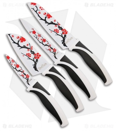 A distinctly Oriental feel of Benchmarks Cherry Blossom 4-Piece Kitchen set, has the tools any functional kitchen needs. Stainless steel blades feature a simple but pleasing black and red Cherry Blossom motif and balanced black and white polymer handles to balance your feng shui. Includes a full sized Chef’s, Santoku, Utility and Paring knives. To maintain the vibrant colors, hand washing is recommended.