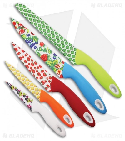 Colorful, playful and functional, the Fruits and Vegetable 5-Piece knife set is a fun addition to any kitchen. With images of apples, berries, tomatoes, lemons and grapes, each knife brings a bright flair to your kitchen. Includes a bread knife, large and medium chef’s knife and medium and small paring knives for any job you need done. Rubberized handles are comfortable in hand while providing a secure grip even while wet. To maintain the vibrant colors, hand washing is recommended.