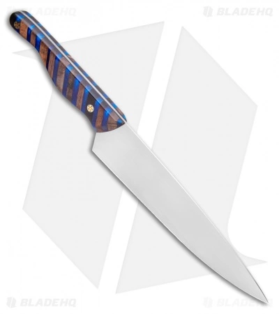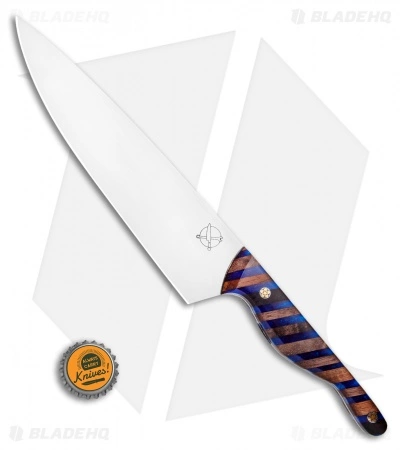 The Mule from Blue Collar Blades is a large 13″ chef knife with a uniquely ergonomic handle. Blue Collar Blade worked with cooking professionals to design a handle that performs flawlessly in the kitchen with a sleek style that’s all it’s own. It has a blade made from AEB-L stainless steel for a tough blade with maximized edge retention. The handle showcases impressive witte teal “ShokRes” with white g-10 liners. Solid carbon fiber pins complete the outstanding design. Blue Collar Blades specialize in handcrafted kitchen tools that elevate the cooking experience.