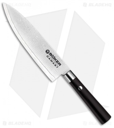 Boker’s Damascus Black and Damascus Olive kitchen lines exhibit beauty and breathtaking cutting capability. The secret to their performance lies in the composition of their blades: 37 layers of Damascus steel with a high-impact VG-10 core, which bears the sharpened edge. VG-10 is a tough, Japanese-made stainless steel capable of becoming and remaining extremely sharp. Each knife is handmade after a traditional Japanese style in Solingen, German, by Boker’s experienced craftsman. They are available with either a black or olive wood handle. Boker Damascus will elevate your cooking experience, making you smile from the very first slice.