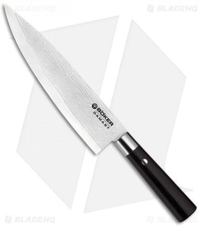 Boker’s Damascus Black and Damascus Olive kitchen lines exhibit beauty and breathtaking cutting capability. The secret to their performance lies in the composition of their blades: 37 layers of Damascus steel with a high-impact VG-10 core, which bears the sharpened edge. VG-10 is a tough, Japanese-made stainless steel capable of becoming and remaining extremely sharp. Each knife is handmade after a traditional Japanese style in Solingen, German, by Boker’s experienced craftsman. They are available with either a black or olive wood handle. Boker Damascus will elevate your cooking experience, making you smile from the very first slice.