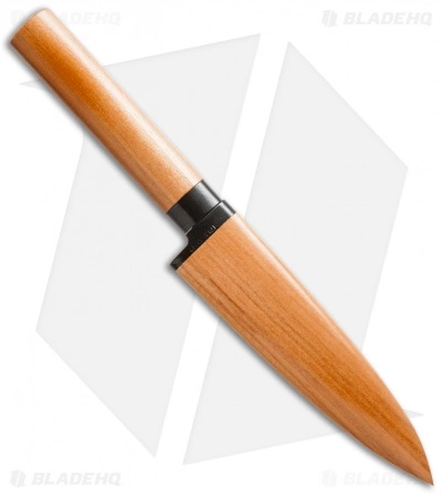 The Suncraft Kengata fixed blade is a traditional cutting knife made in Japan. This knife has a sharp, thin blade that is designed for cutting meat, fish and vegetables. The handle and sheath are made from a beautifully varnished wood that contrasts nicely with the satin finished stainless steel blade. The Kengata makes a great kitchen knife or Japanese collection piece.