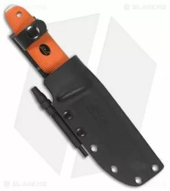 - Orange grooved G-10 handle with a lanyard hole and pocket clip.