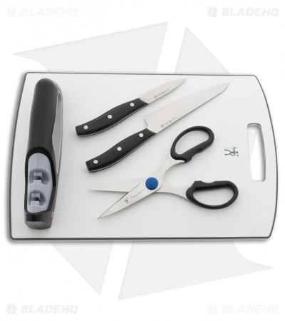The Henckels International Definition series is characterized by high-end feel at an accessible price. The blades have extremely sharp plain edges and tall flat grinds, so the knives feel and cut much like knives twice their price. The set includes a 3″ paring knife, a 5.5″ prep knife, kitchen shears, a cutting board, and a hand-held sharpener.
