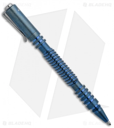 This Investigator Pen model features a blue anodized spiral titanium body with a silver cap.