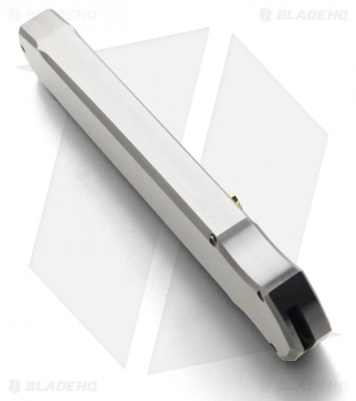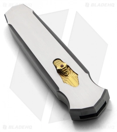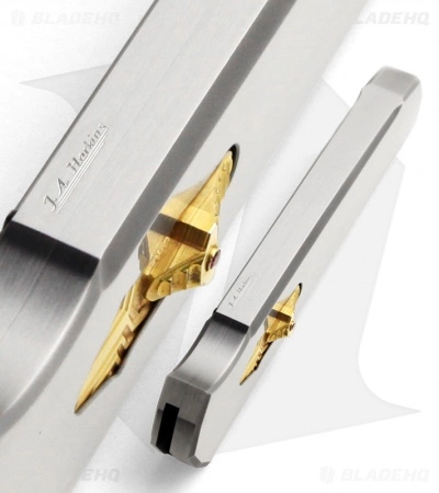 The Triton is an impressive double-action OTF knife. This knife features a Damascus steel blade and stainless steel handle. The firing button is 24k gold plated and features a ruby insert. It’s a very cool custom knife. The handle edge is marked JA Harkins.