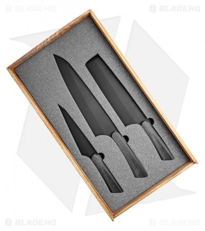 This Tactical Kitchen Knife set from Jake Hoback Knives is exquisite! Each knife is eye-catching and sure to impress your guests. The handles are made out of carbon fiber creating swift and lightweight action. The blades have been forged from Bohler M390 stainless steel with a black PVD coat. Jake Hoback strived for quality blade materials that would hold their edges and last during repetitive use and washing. These knives are meant to be used by professionals or at home chefs to enjoy their cooking experiences.