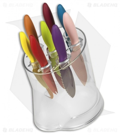 Brighten up you kitchen with the Pure Komachi 2 9-Piece Block Set. This kitchen knife set comes with Pure Komachi 2 most wanted pieces: 4″ Citrus Knife, 4″ Tomato Knife, 8″ Bread Knife, 8″ Chef’s Knife, 6.5″ Hollow Ground Santoku Knife, 6″ Multi-Utility Knife, 5.75″ Sandwich Knife, and 3.5″ Paring Knife. These multi-colored knives shine through the clear, acrylic block, so you will be able to enjoy your cutlery collection—even when you are not cooking. The open air designed block helps guard against bacteria growth.