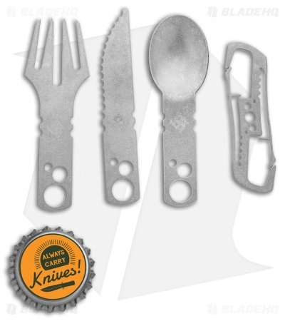 Dine on the go in style with the Koch Tools TiWare set. This camp cutlery set comes with a fork, knife, and spoon made from stonewashed titanium. The utensils clip to a carabiner for convenient carry. Add some Koch Tool style to your camping gear with the TiWare set.