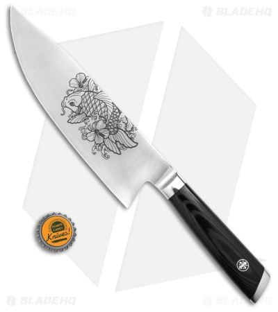 This Production Bowie Chef has an 8″ blade made of stainless steel-clad VG-10 and a black micarta handle. The blade is engraved with a unique Koi graphic.