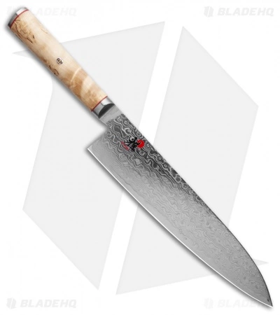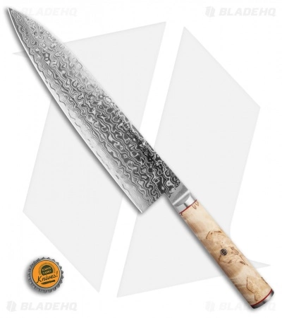 The Miyabi Birchwood 9″ Chef’s Knife is a large chef’s knife built for large amounts of food. The blade is long, but is very well balanced. It is hand made in Seki, Japan, and has perfect fit-and-finish. The blade has a Damascus shell with a premium SG2 core, ice hardened to a perfect 63 HRC. This knife will exhibit great edge retention and wear resistance, and will be the focal point of your kitchen.