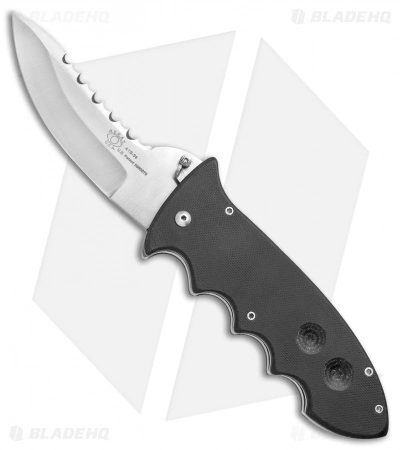 The Pocket Hobbit from REKAT knives sports a truly unique design with a lever lock mechanism on the top of the handle. It has a smooth G-10 handle with finger grooves and stainless steel liners. The blade is made from ATS-34 steel with a modified drop point style and a serrated sawback spine. Item includes a kydex sheath with a belt clip. The Pocket Hobbit is a truly unique vintage knife that will make a great addition to any collection.