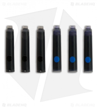 This listing is for three black + three blue Schrade fountain pen refill ink cartridges. These are for the Schrade SCPEN3 Tactical Pen.