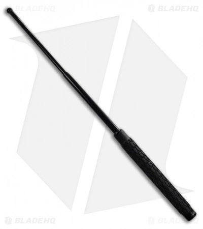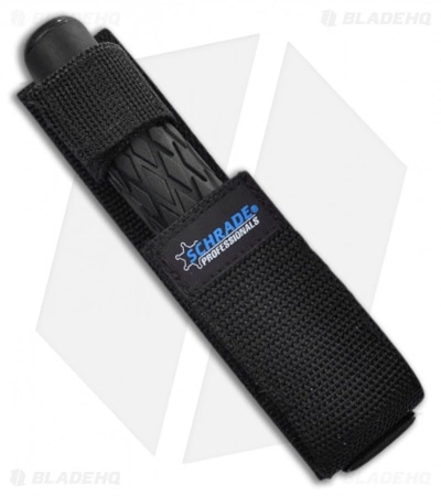 Self Defense Baton. The SCBAT24 Schrade baton has two segments that extend out making the total baton 24 inches in length. To extend the baton you simply swing the handle and the segments extend out and lock into place. Locking in the open and closed potion is accomplished through friction. The baton has a black finish, and a rubberized grip. Also included is a heavy duty black nylon sheath. The Schrade tactical baton series represents a good synthesis of quality, cost, and defensive power.