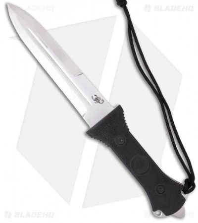 The double edged blade is diamond ground, mirror polished with ridged top and blood groove. The knife weighs in at just under one pound (390g) and is perfectly balanced in the hand. The handle features black “ERGO” scales. Includes nylon/Cordura sheath.