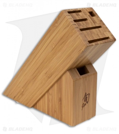 This knife block is the perfect kitchen accessory for your Shun kitchen knives. This block is made from bamboo wood. It has 6 slots; 2 for larger knives and 2 that’ll fit smaller or medium knives. There’s one slot that’ll harbor kitchen shears and one that’ll hold the honing stone to maintain edges of your kitchen blades.