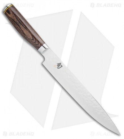 While each knife takes at least 100 handcrafted steps to complete, the materials Shun uses for the Premier line are among the most advanced in the industry. Each blade has a cutting core of Shun’s proprietary VG-MAX “super steel” to take and hold a precision edge. The layered Damascus cladding supports the core and provides additional stain resistance.