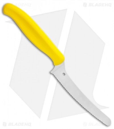 This Spyderco Z-Cut has a yellow handle and a blunt tip with a serrated edge.