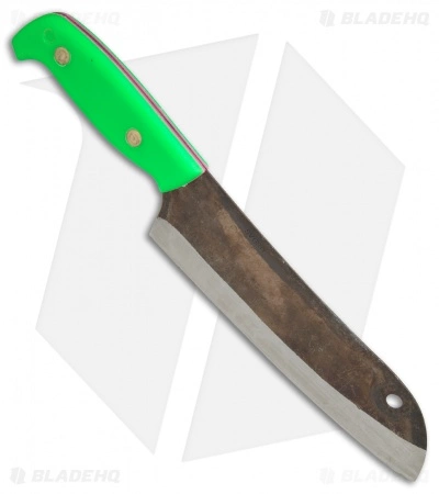 This version of the Kiwi Santoku has a patina finished blade and a green handle with pink liner accents.