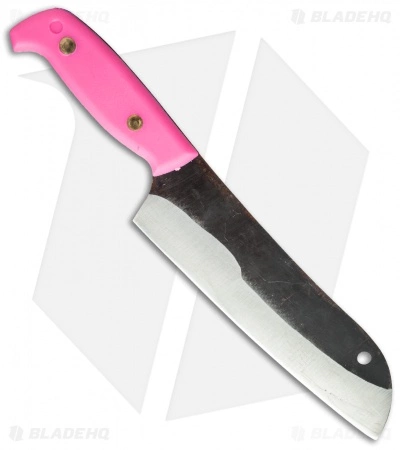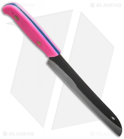 The Kiwi Santoku knife from Svord features a full-tang 15N20 high carbon steel blade for efficient cutting in the kitchen. This model has a pink polypropylene handle with blue liner accents. The blade comes in a two-tone finish with black flats and satin grinds. Ships with a blade edge guard.