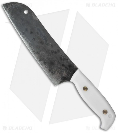 The Kiwi Santoku knife from Svord features a full-tang 15N20 high carbon steel blade for efficient cutting in the kitchen. This model has a white polypropylene handle with red liner accents. The blade comes in a two-tone finish with black flats and satin grinds. Ships with a blade edge guard.