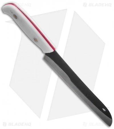 This version of the Kiwi Santoku has a two-tone finished blade and a white handle with red liner accents.