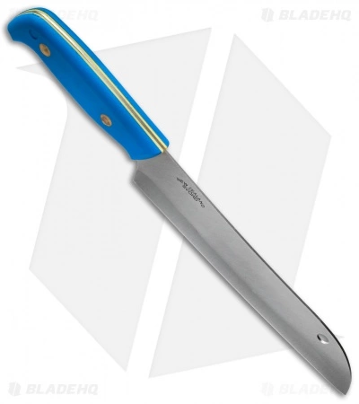 The Kiwi Santoku knife from Svord features a full-tang 12C27 steel blade for efficient cutting in the kitchen. This model has a blue polypropylene handle with yellow liner accents. The blade comes in a sheepsfoot style with a satin finish. Ships with a blade edge guard.
