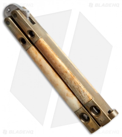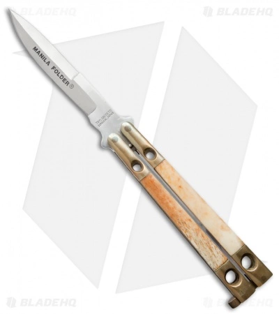 The Taylor Seto Manila Folder balisong has brass channel construction handles with bone inlays. It has a spear point style blade with a sharpened upper edge. The blade is marked “MANILA FOLDER” and is stamped “TAYLOR/SETO SURGICAL JAPAN” on the tang.