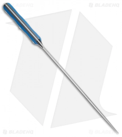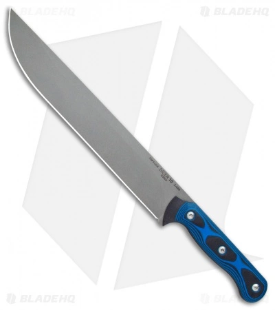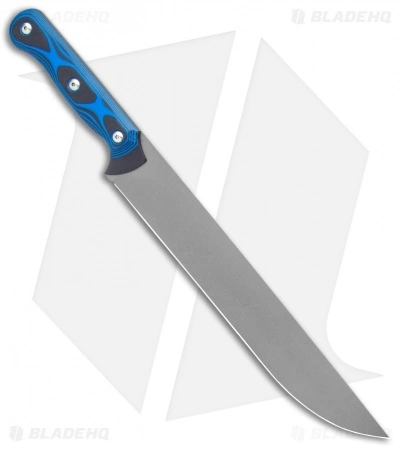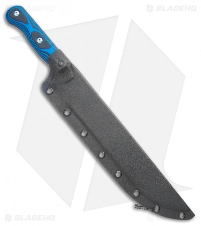 - Black and blue sculpted G-10 handle with a suitable grip.