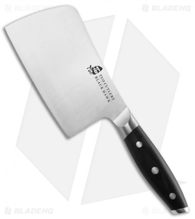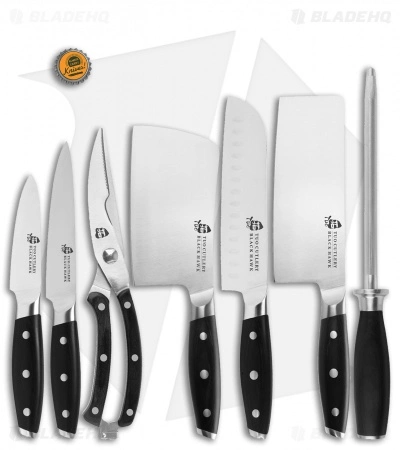 The Tuo Black Hawk line features triple-riveted black pakkawood handles, forged bolsters, and X50CrMoV15 blades.