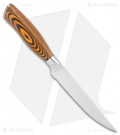 Have a limited budget, but looking for something nice for your table? This serrated steak knife set fits the bill, offering knives that stand-out in both aesthetics and cutting capability. Each has an orange and black pakkawood handle with a 5″ serrated blade.