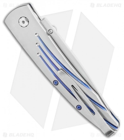 This William Henry Custom Lancet Vanguard has a milled titanium handle with blue anodized ribbing. The blade is made of a differentially heat treated ZDP-189 blade. The button lock and the thumb stud are eloquently inlaid with real sapphires. They perfectly tie the design all together in to one magnificent piece of cutlery.
