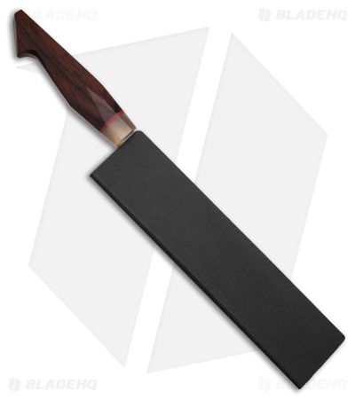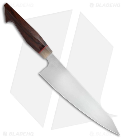 The Xin Cutlery XinCraft Multangular 9″ Chef Knife combines modern beauty and practicality in a stunning way. It boasts a simple stonewash finish and a thin grind for no-nonsense cutting. It has Sandvik 14C28N stainless steel for the blade, an all-around good steel: especially for kitchen knives that are often exposed to corrosive elements. Its handle is made from rosewood with a buffalo horn bolster and nickel silver. This cutter is eye-catching for its beauty, and a joy to use for its cutting power.