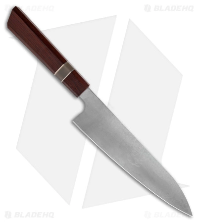 The Xin Cutlery XinCraft Octagonal 9″ Chef Knife combines beauty and functionality in a wonderful way. It has a Damascus steel blade with a VG10 steel core, giving it great edge retention and sharpness. Its handle employs a stunning combination of materials: rosewood, buffalo horn, and nickel silver. The knife is something to behold, but make no mistake: it will cut like a champion in kitchen.