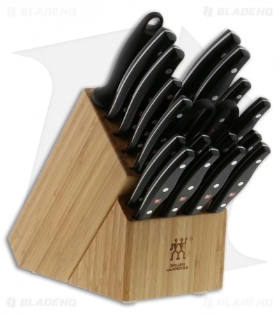 The Zwilling J.A. Henckels Twin Signature 19 Piece Block Set includes a 2.75″ Birds Beak Peeling Knife, a 4″ Paring Knife, a 4.5″ Utility Knife, a 5″ Serrated Utility Knife, a 6″ Utility Knife, a 7″ Hollow Edge Santoku, an 8″ Chef’s Knife, an 8″ Bread Knife, eight 4.5″ Steak Knives, Kitchen Shears, a 9″ Sharpening Steel, and a 20-slot wood block.